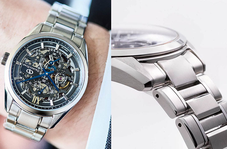 H型の駒パーツを使用したメタルバンドは、腕への馴染みとケースとの一体感を追求し心地よい装着感を実現しています。
