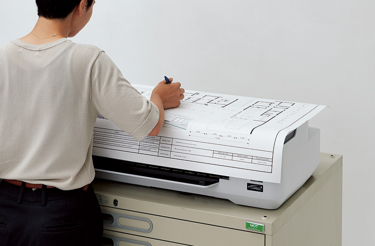 友廣例えば、建設現場や設計事務所では、大判の設計図面や施工図面を広げて話し合い、決まったことや作業指示を書き込んでいくことがあります。そして、指示などを書き込んだ図面をコピーして関係者で共有します。そのため、「SC-T3150 M」は図面のスキャンを想定し、標準設定の「文字・線画」モードで小さな文字や細線もはっきりスキャンやコピーできるように画質を作り込みました。紙だけでなくデータでも図面をやり取りできるように、PCレスでスキャンにも対応しています。