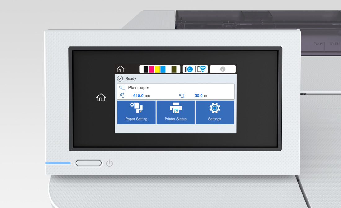 林大判プリンターの多くは業務で使われているとはいえ、必ずしも機器に詳しい方が操作されるとは限りません。不慣れな方にしてみれば、日々使うものと同じような感覚で操作したいものです。多くの方にとって身近な存在、それはスマートフォンやタブレット端末ではないでしょうか。「SC-T3150シリーズ」はエプソンの大判プリンターとして初めてタッチパネルを搭載しました。スマートフォンと同じように、表示されたボタンを指でポンと触れて操作でき、操作方法はイラストで分かりやすく案内しているので、導かれるままに出力まで進むことができます。
