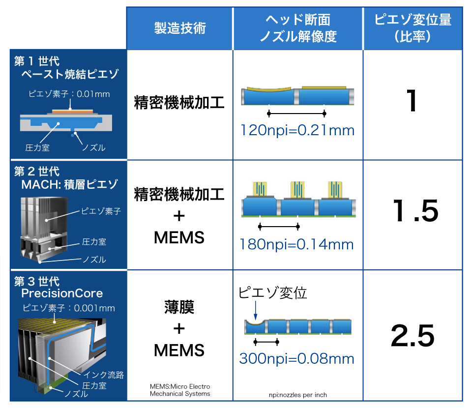 ピエゾ素子は、薄くなると同じ印加電圧でも変位量がより大きくなりますが、薄くすることで脆くなるため、加工や取り扱いが難しくなります。この課題を解決する方法として、薄いピエゾ素子を重ねて形成した積層ピエゾ(Multi-LayerPiezo)をアクチュエータとして採用し、ピエゾ素子の縦振動によりインクを吐出する「MACH(Multi-layer Actuator Head)」方式のプリントヘッドが開発されます。これにより、高密度・高応答性を実現し、インクジェットプリントは大きく飛躍しました。