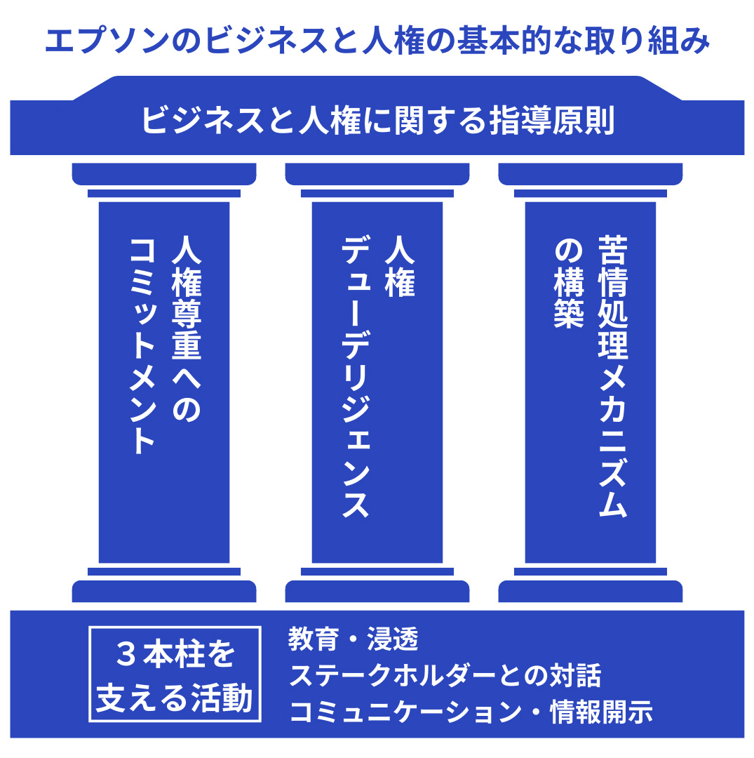 エプソンは、人権尊重に対する基本的な考え方を示し、その最上位の指針として『エプソングループ人権方針』を制定しました。社員一人ひとりが人権侵害を起こさず、助長や加担もしないよう取り組むことを定めています。