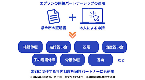 エプソンは、人権尊重の観点から、性的マイノリティに配慮した公平な環境づくりを進めています。2025年1月からは、婚姻に関わる一部制度で同性パートナーへの適用を開始しました。
