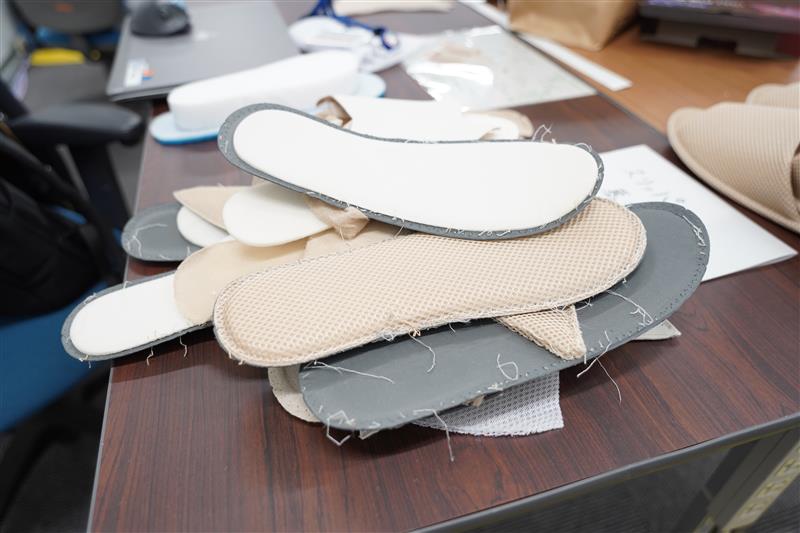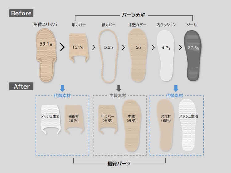 スリッパを分解して各パーツの重量配分を調べ、重い部分は除去もしくは軽い素材と交換した。